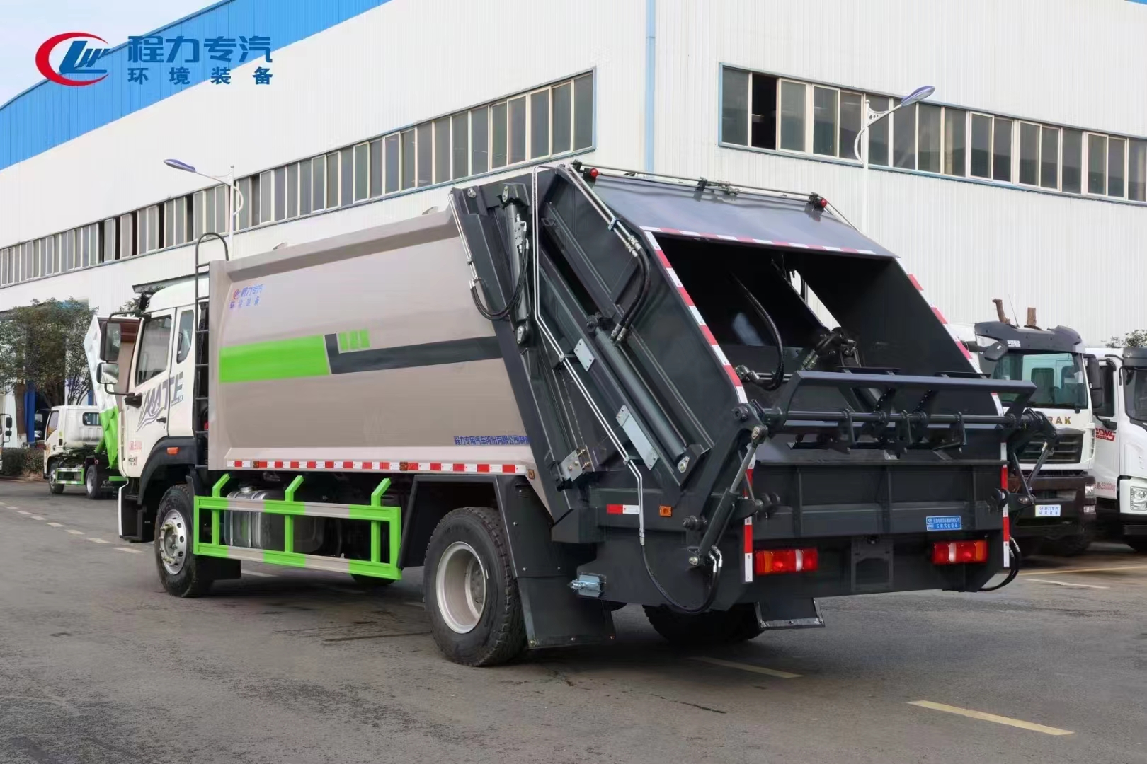 上裝配置 整車上裝箱體采用高強(qiáng)度鋼制作,容積約16/18立方,新式可破碎刮板,后置污水箱,雙向蠕動(dòng)壓縮,國(guó)內(nèi)知名品牌液壓系統(tǒng),恒力油缸,中梅多路閥,嘉善取力器,合資品牌睿辰鐵殼齒輪泵,駕駛室內(nèi)及車身外集中CAN電控系統(tǒng),尾部可選裝掛桶翻轉(zhuǎn)機(jī)構(gòu),帶氣動(dòng)后蓋,可實(shí)現(xiàn)垃圾桶的翻轉(zhuǎn)傾倒上料,亦可選裝擺臂裝置、三角斗裝置、大落地全密封斗裝置等進(jìn)料裝置。壓縮比高,液壓系統(tǒng)穩(wěn)定可靠,高品質(zhì)、高性價(jià)比!