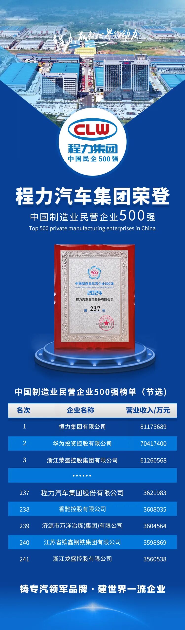 在同期發(fā)布的“2024中國(guó)制造業(yè)民營(yíng)企業(yè)500強(qiáng)”榜單中,程力汽車集團(tuán)光榮登榜,位列第237位;據(jù)悉, 2023年民營(yíng)企業(yè)500強(qiáng)營(yíng)業(yè)收入總額41.91萬(wàn)億元,戶均838.22億元,較上年增長(zhǎng)5.22%;資產(chǎn)總額49.85萬(wàn)億元,戶均996.94億元,較上年增長(zhǎng)7.64%??傮w來(lái)說(shuō),呈現(xiàn)出經(jīng)營(yíng)規(guī)模穩(wěn)步增長(zhǎng)、總體效益實(shí)現(xiàn)提升、產(chǎn)業(yè)結(jié)構(gòu)持續(xù)優(yōu)化、創(chuàng)新能力不斷增強(qiáng)、社會(huì)責(zé)任積極履行等良好態(tài)勢(shì)。