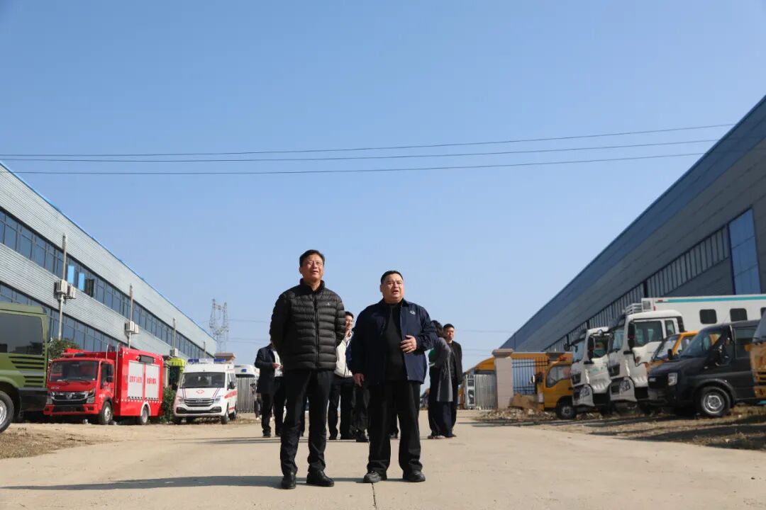 上圖:江鈴汽車集團黨委書記、董事長邱天高(前排左一)與程力汽車集團董事長程阿羅(前排中)、程力醫(yī)療設備廠裴銳總經(jīng)理(前排右)等領導嘉賓參觀專用汽車及應急裝備生產(chǎn)車間,調(diào)研了解公司經(jīng)營情況。