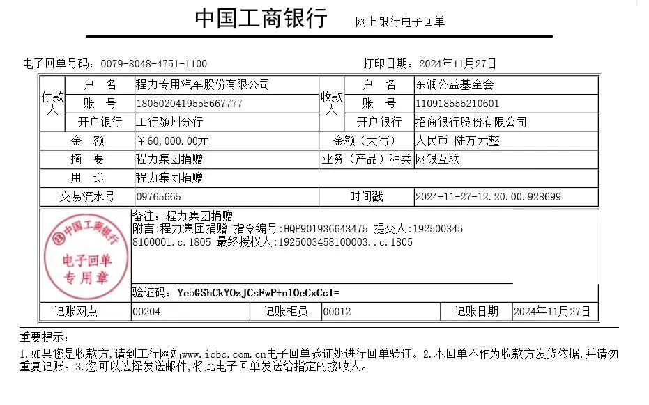 2024年11月27日,程力汽車集團旗下核心企業(yè)----程力專用汽車股份有限公司,向東潤公益基金會捐款60000元,用于弘揚公益精神和助力國家科學人才培育,以及賑災濟難、撫貧濟困、獎教助學,改善經(jīng)濟欠發(fā)達地區(qū)青少年的生活、學習條件,幫助其提高自身發(fā)展能力,為國家培養(yǎng)具有國際競爭力的新一代人才做貢獻。