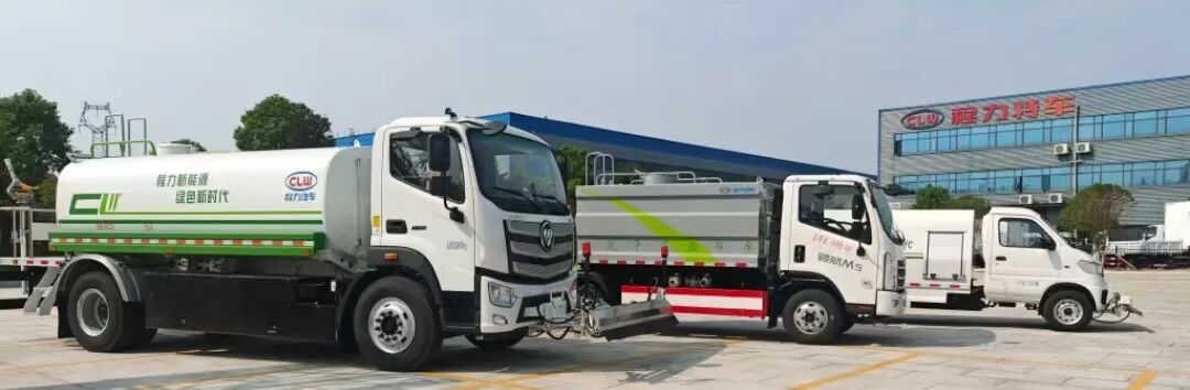 汽車公司的三款主打新產(chǎn)品從左至右,分別是新涂裝多功能爆款灑水車、新能源瀝青灑布車、新能源道路清洗車。