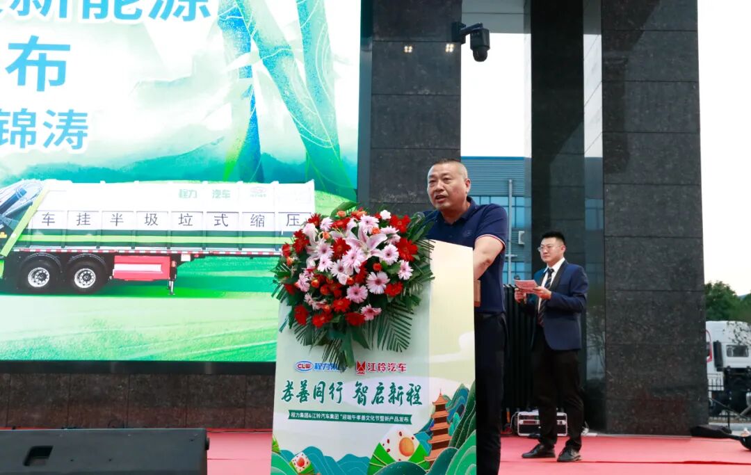 程力汽車公司總經(jīng)理程錦濤(上圖)宣告:"程力新能源環(huán)衛(wèi)車、瀝青灑布車及新涂裝燃油灑水車、壓縮垃圾車、半掛壓縮垃圾車清運車,煥新正式上市!
