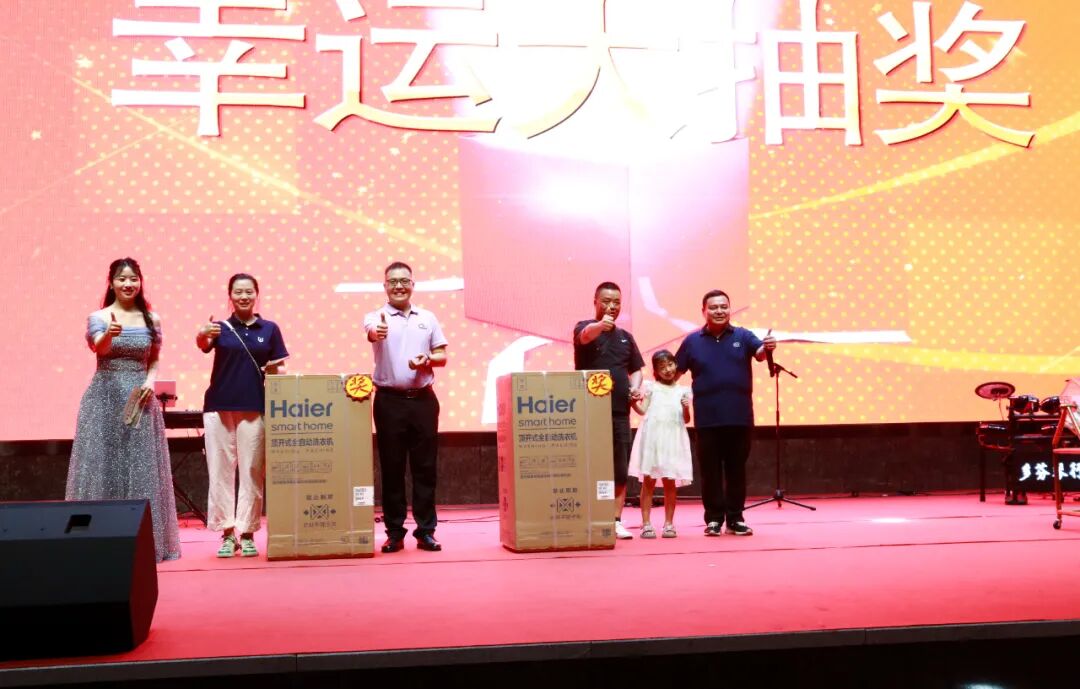 二等獎(jiǎng)共2名,由江鈴銷售有限公司副總經(jīng)理李闖(左三)、程力集團(tuán)董事長程阿羅(右一),現(xiàn)場隨機(jī)抽取,并贈(zèng)送海爾洗衣機(jī)獎(jiǎng)品各一臺(tái)。