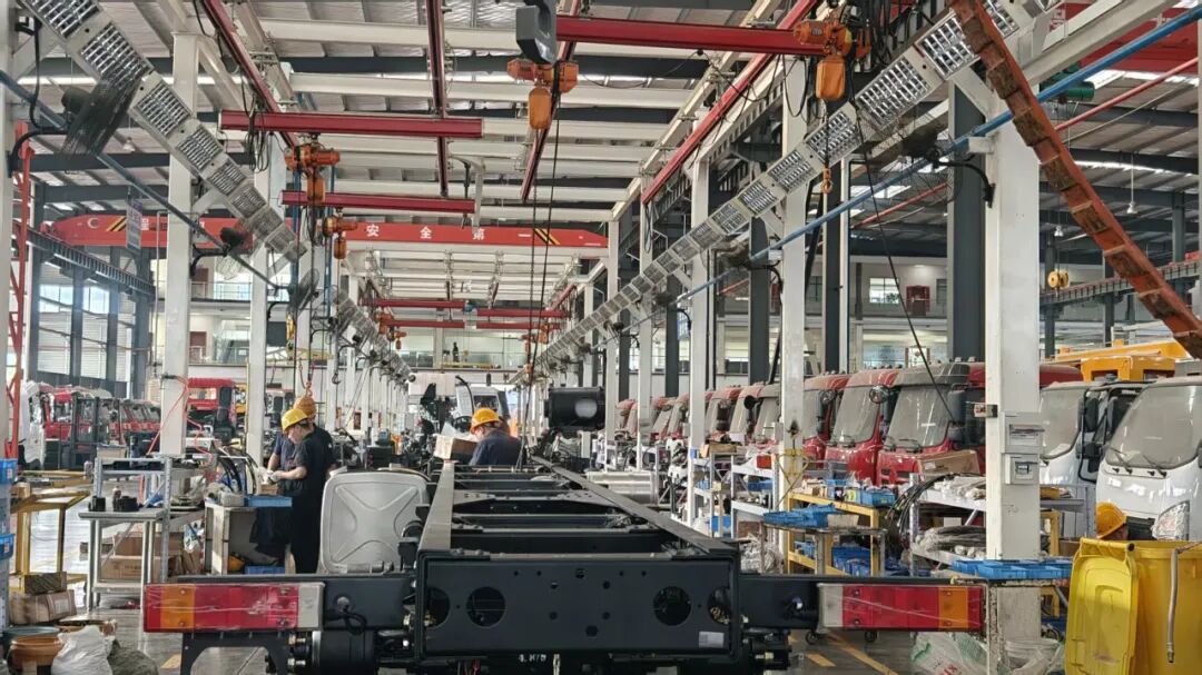 圖二(上):程力重卡底盤裝配線上,一大早就開足馬力忙生產(chǎn)。