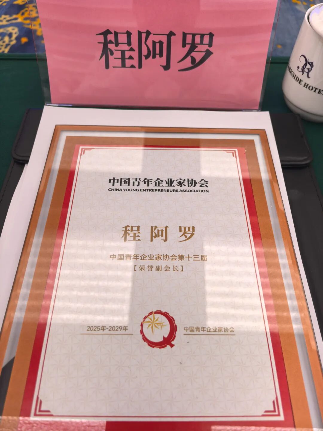 上圖:中國(guó)青年企業(yè)家協(xié)會(huì)授予程阿羅董事長(zhǎng)“中國(guó)青年企業(yè)家協(xié)會(huì)第十三屆榮譽(yù)副會(huì)長(zhǎng)”證書。