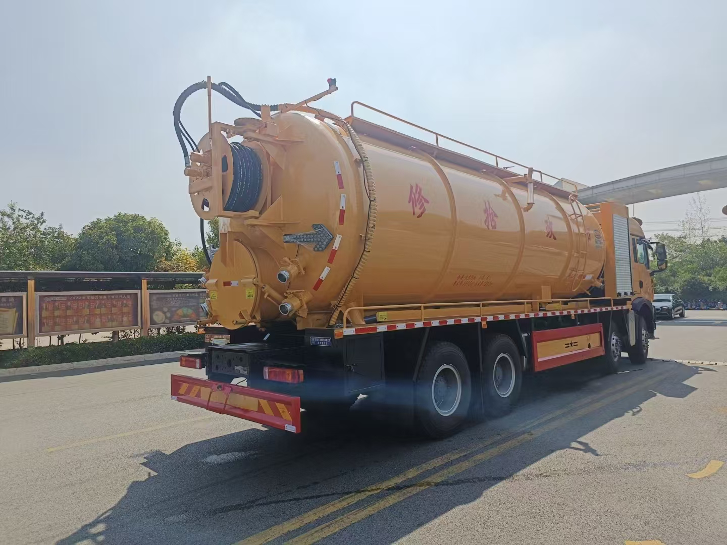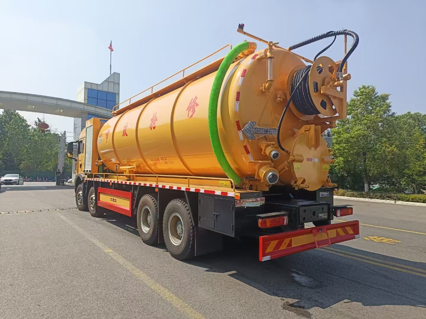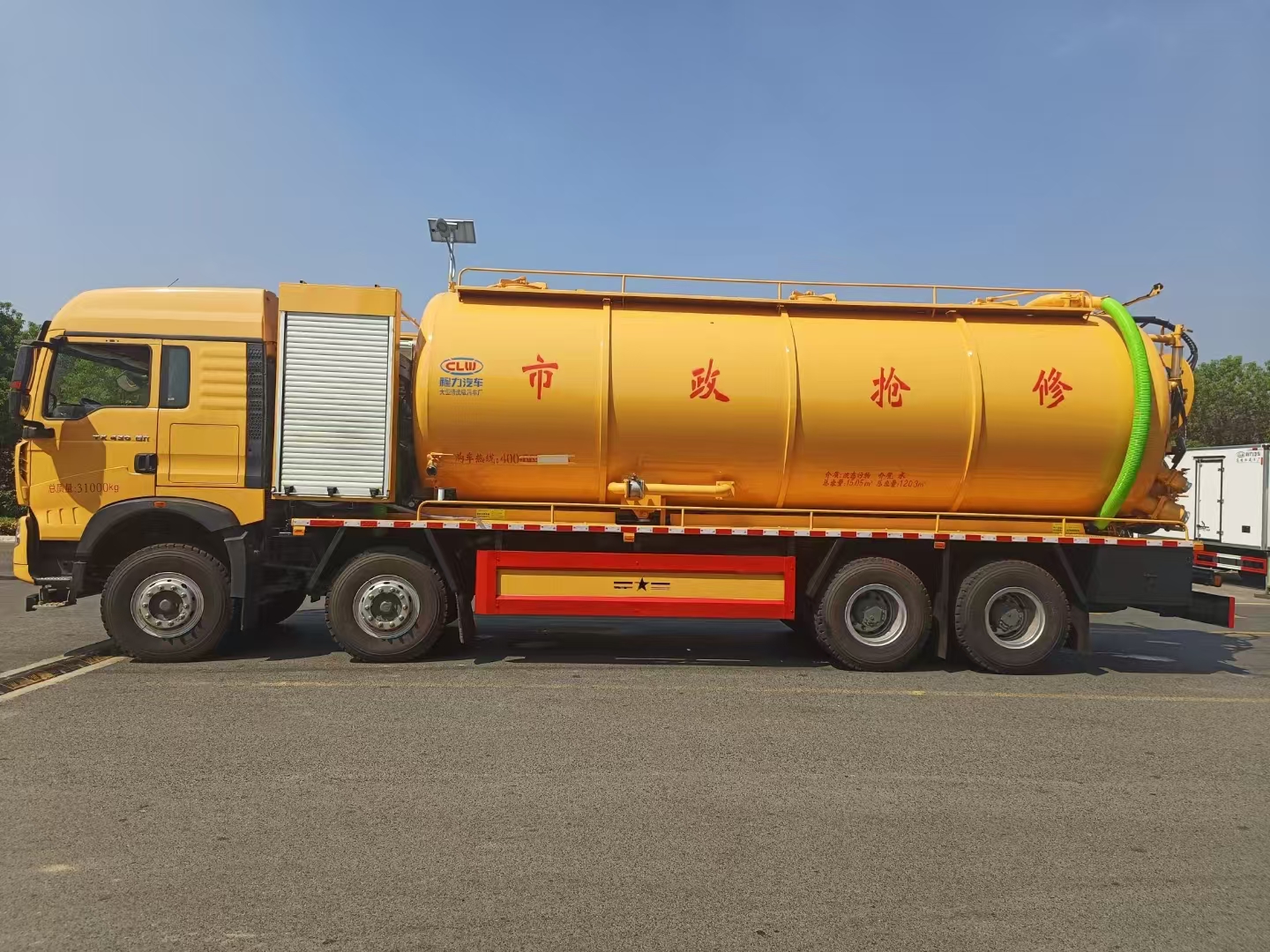 | 上裝配置 | 罐體總?cè)莘e約33立方,清水箱約10立方,其余為污水罐,加強(qiáng)大架,兩倉互通,采用8mm碳鋼制作,吸污部分,副發(fā)采用420馬力配258水循環(huán)泵,8米吸污管,罐體兩側(cè)加寬平臺加護(hù)欄,后部開一個600mm液壓開啟排污口,一個150排污球閥,和一個100的排污球閥,100內(nèi)抽球閥,后部左右各一個箭頭燈,配品浮350流量,配100米內(nèi)徑25定制耐磨高壓管,帶卷盤,卷盤液壓左右旋轉(zhuǎn)。 | ||
